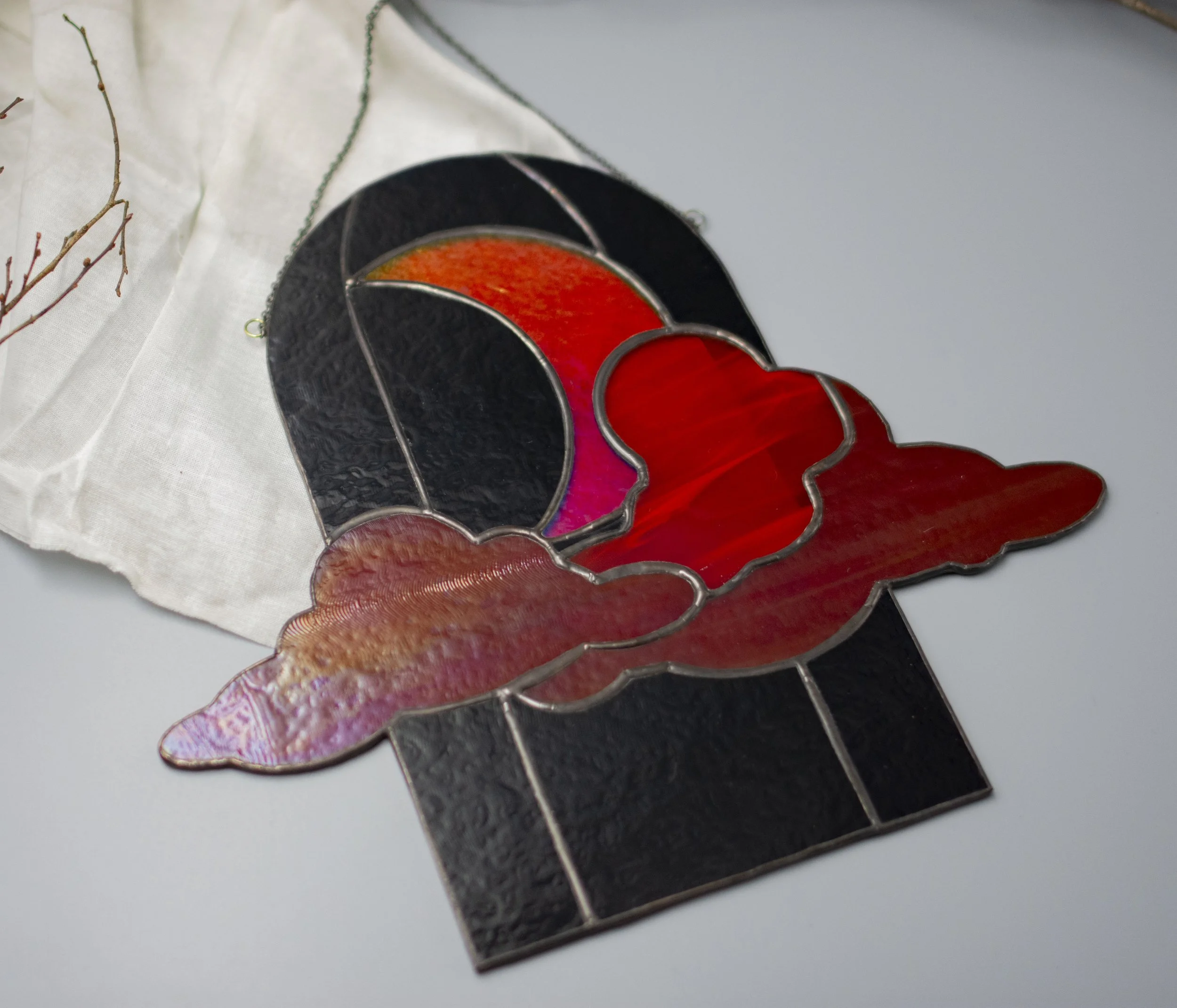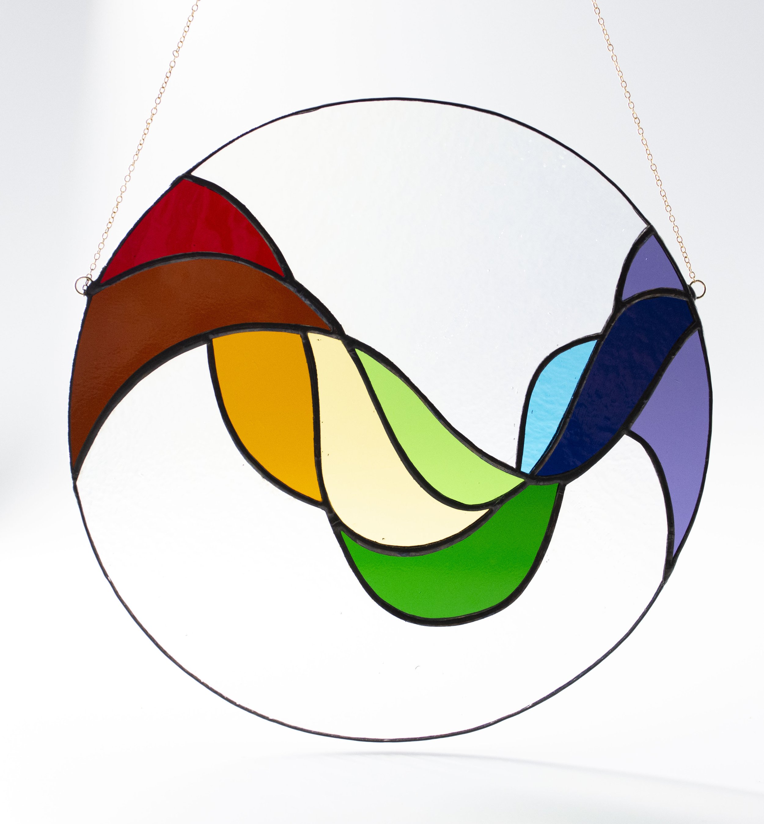 Pride is a riot (of color)! Declare your pride year-round with a rainbow wave of glass set in a clear iridescent rainbow circle. This 8” circle window panel casts beautifully colorful shadows and glows with color in sunlight. It hangs 6” down from a thin gold chain - please note that hanging hardware is not included.